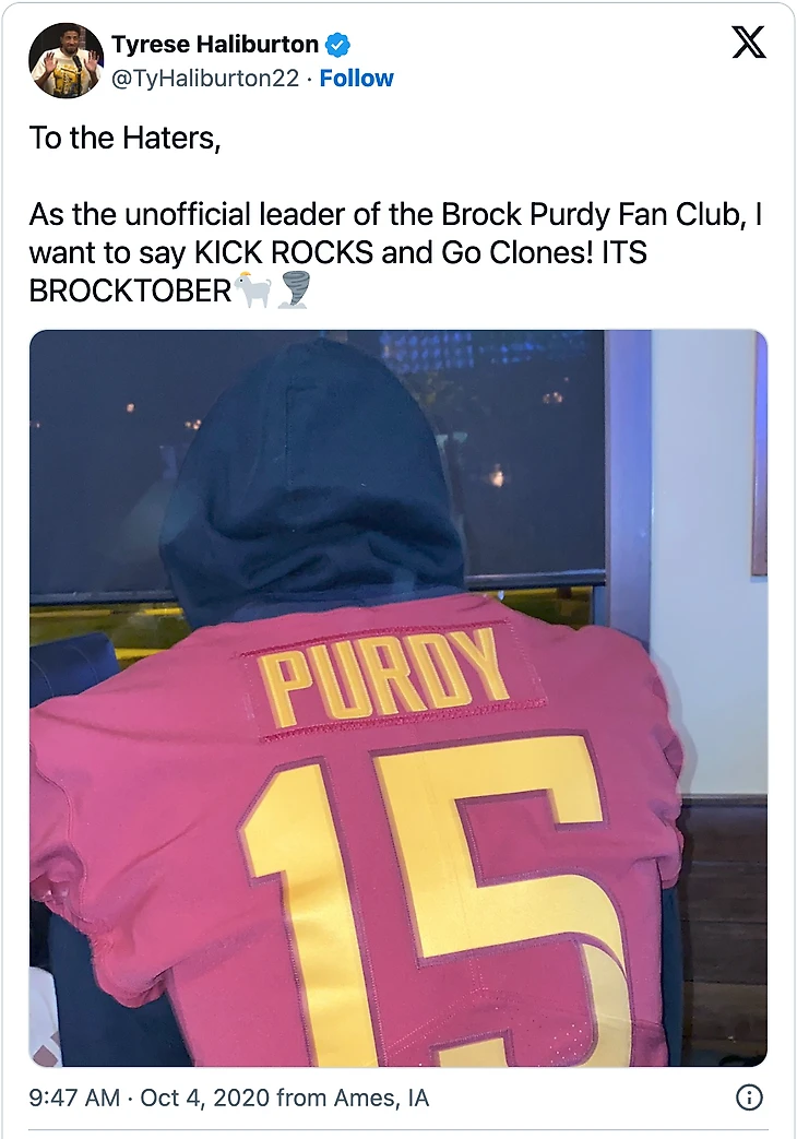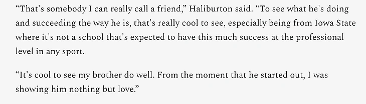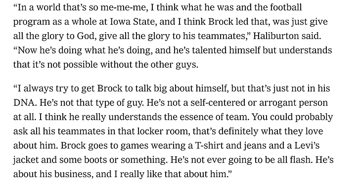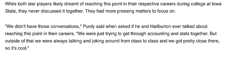 И в этом тексте был упомянут и Тайриз Халибертон – однокурсник и очень близкий друг Брока, с которым они одновременно поступили в глухой и заштатной университет Айова Стейт в далеком 2018 году, где они оба были третьеразрядными новичками, глубокими запасными, там они каким-то образом познакомились и сдружились, постепенно пробились в старт своих команд Циклонов – футбольную и баскетбольную соответственно, со временем стали сначала звездами этого университета – а потом спустя годы и суперзвездами НБА и НФЛ.