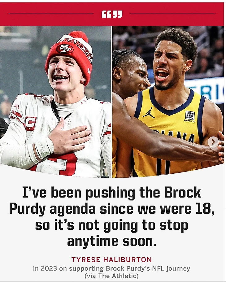 Одна из интересных вещей, о которой рассказал недавно Брок – что уже во время финала НБА – когда все внимание Тайриза должно быть целиком и полностью сосредоточено на Оклахоме – он нашел время ознакомиться с выпущенным расписанием НФЛ и обнаружив там матч Индианаполис Кольтс – СФ 49ерс 22.12.2025 тут же написал Броку что готов его встретить в Индианаполисе и обеспечить его семье и друзьям лучшую вип-ложу на стадионе. Они иногда так встречаются в СФ во время визитов Пейсерс к Уорриорз и вот теперь собираются встретиться во время визита 49ерс к Кольтс, которые происходят намного реже.
