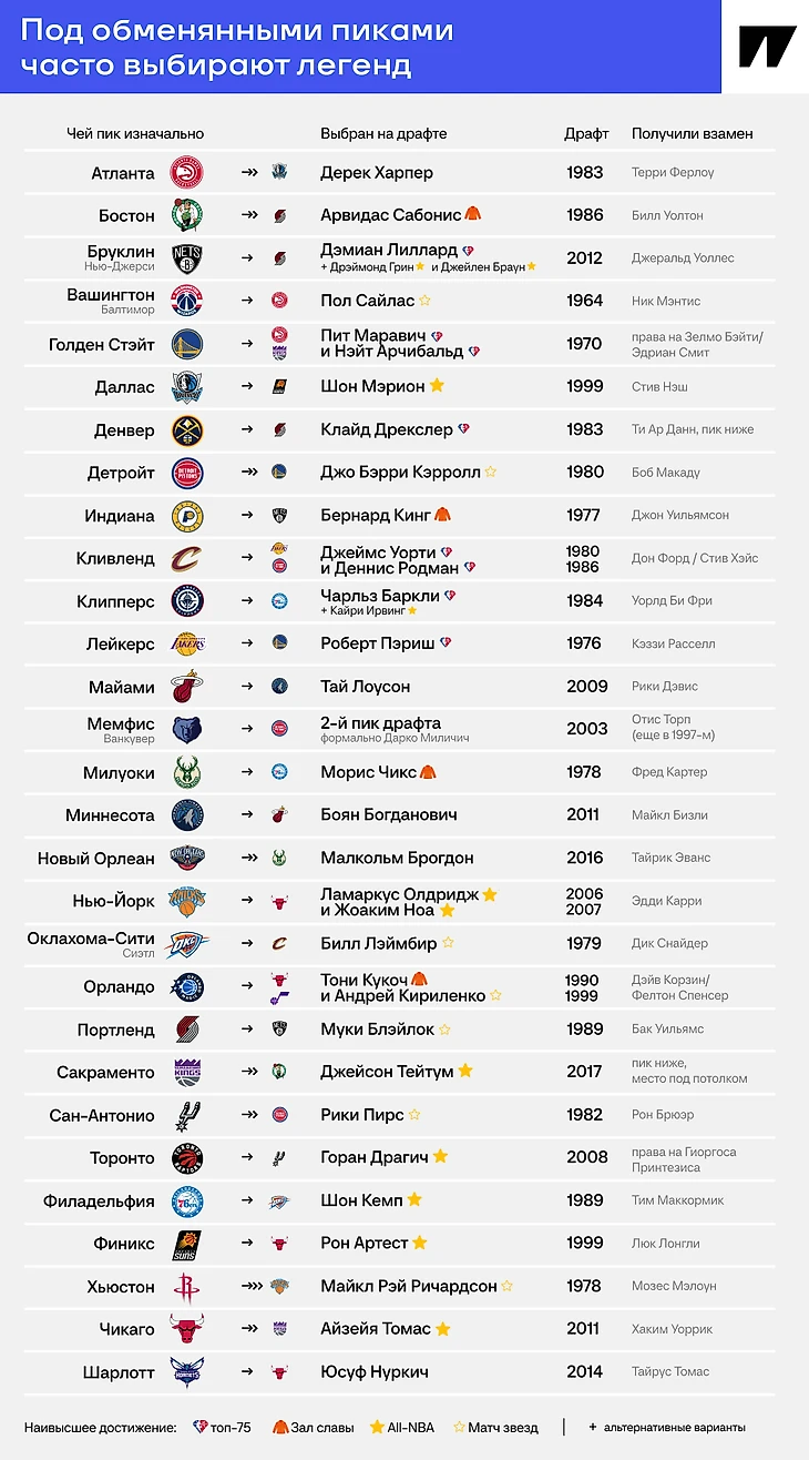 Все обмены, завершившиеся выбором звезды под приобретенным пиком, здесь не отражены. В таблице – по одному самому яркому примеру таких обменов пика для каждого клуба НБА, в отдельных случаях – альтерантивные варианты. Но все равно не поместились такие интересные примеры, как Род Стрикленд (изначально пик «Чикаго»), Трак Робинсон («Финикс»), Терри Портер («Даллас») и современные: Джейлен Уильямс («Клипперс»), Микэл Бриджес («Лейкерс»), Шенгюн («Бостон»), Макси («Оклахома»), Вагнер («Чикаго») и даже Гершон Ябуселе («Даллас») .