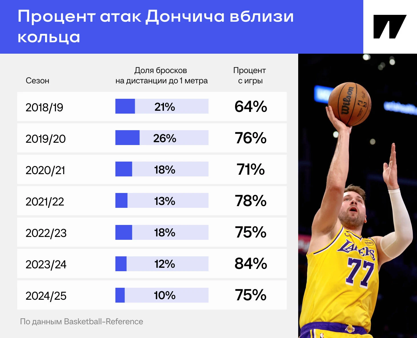 Вот как выглядит статистика реализации бросков Луки в близкой дистанции в первые семь полноценных сезонов за «Даллас».