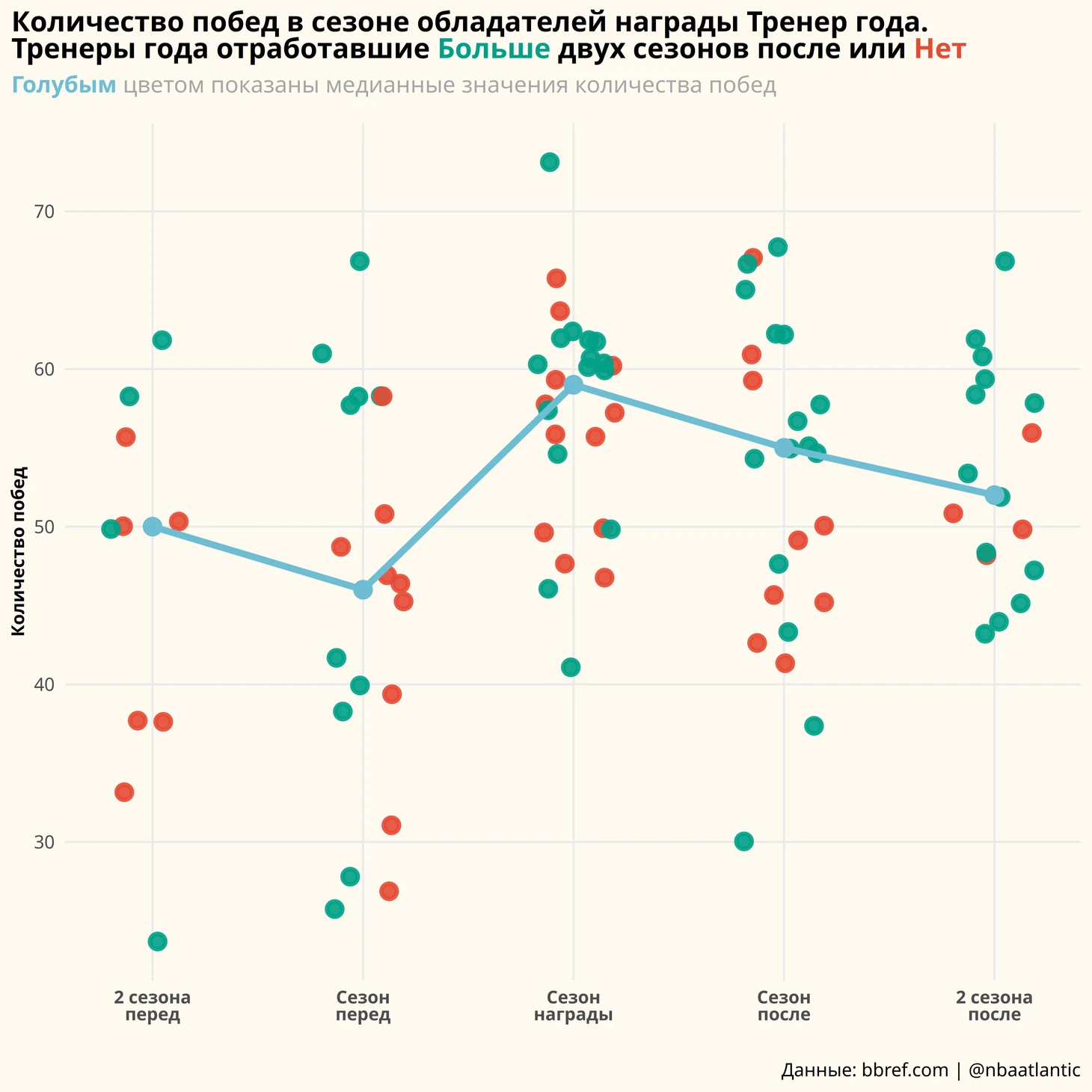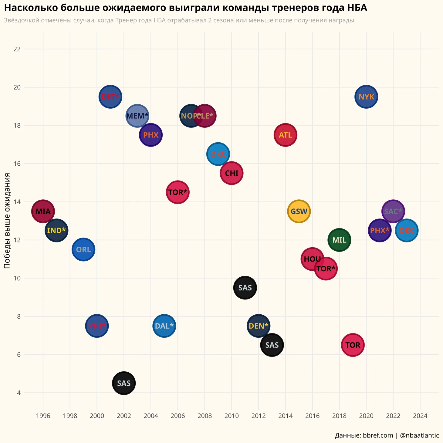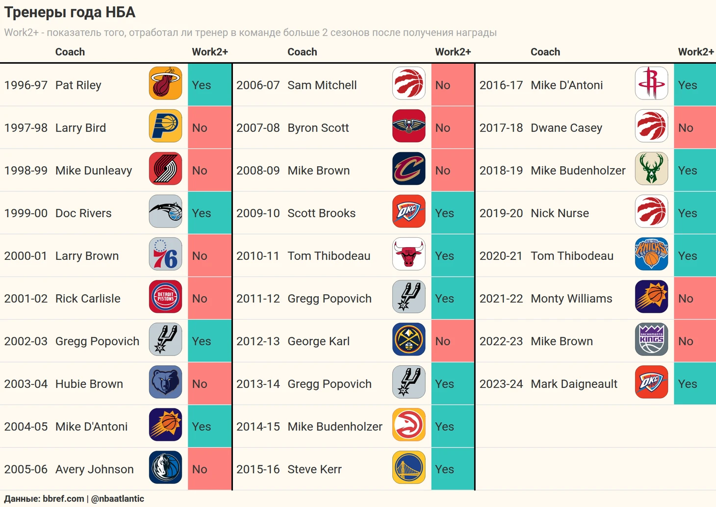 Видно, что из последних 15 тренеров года НБА (начиная со Скота Брукса в Окле 2009/10 и заканчивая Марком Дэйгнолтом в Окле-23/24) только 4 тренера (Джордж Карл, Дуэйн Кейси, Монти Уильямс и Майк Браун) отработали 2 сезона или меньше в команде после получения награды. Для сравнения: с сезона-1996/97 по 2008/09 9 из 13 тренеров года лишились работы через два сезона или менее после награды.