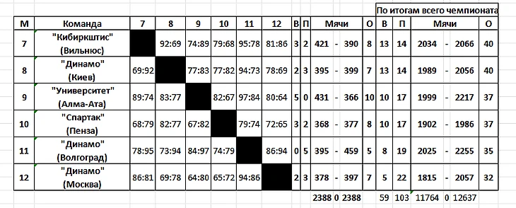 Положение команд после 16 матчей. 1. ТТТ — 16 побед. 2. ЦСКА — 12. 3-7. «Динамо» (Киев), «Спартак» (Ленинград), «Динамо» (Новосибирск), «Спартак» (Московская область), «Горизонт» — по 9. 8. «Динамо» (Волгоград) — 7. 9-10. «Кибиркштис», «Спартак» (Пенза) — по 5. 11. «Университет» — 4. 12. «Динамо» (Москва) — 2.