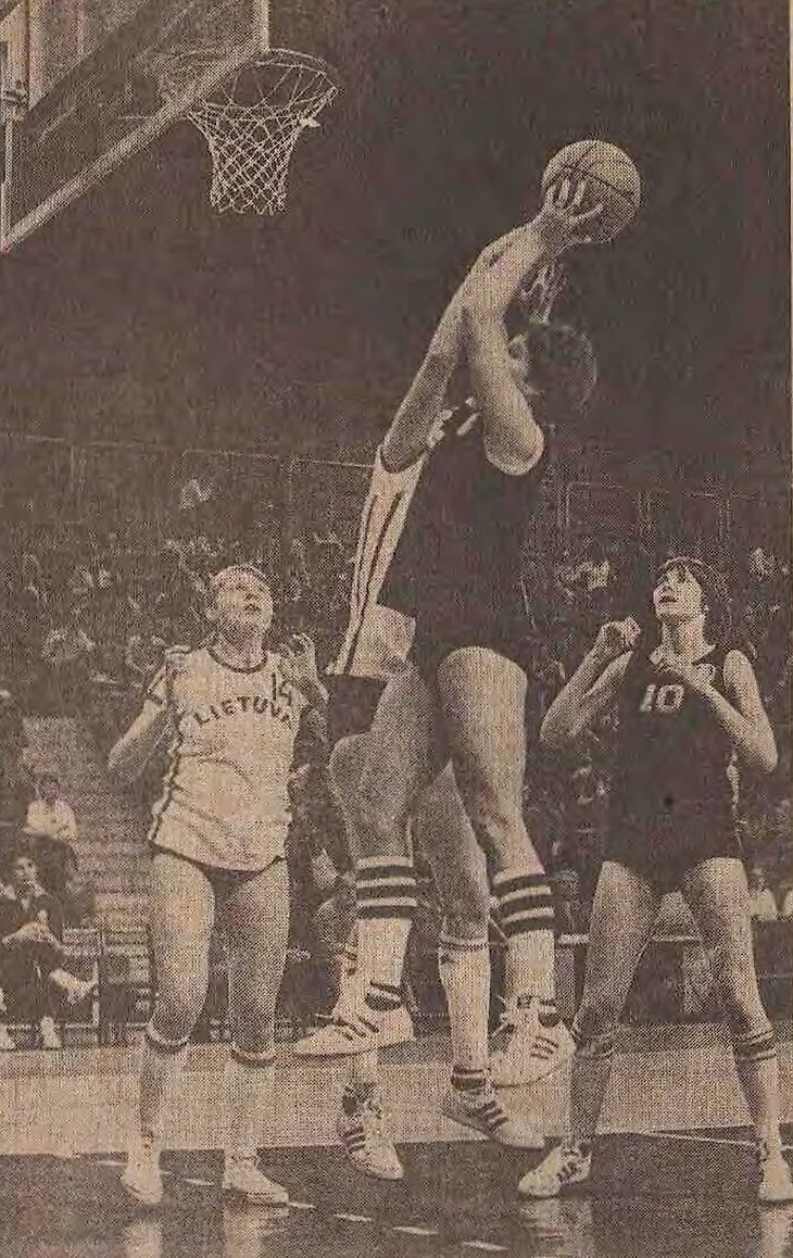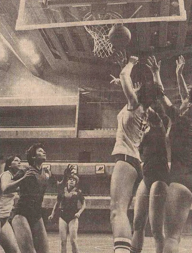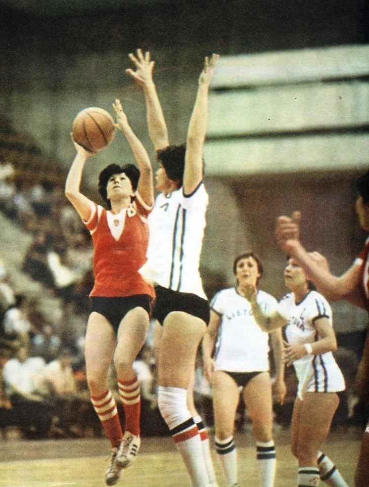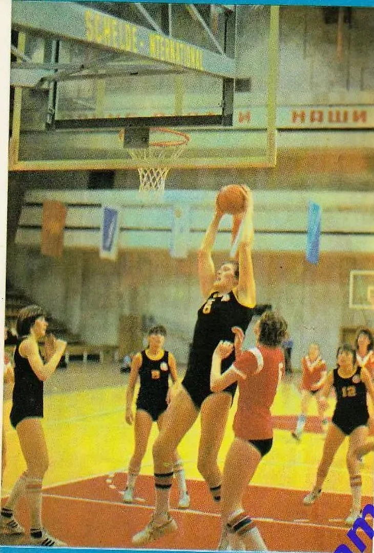 Май 1983. Москва. Матч VIII летней Спартакиады народов РСФСР Латвия — Литва — 65:48. Майя Шилиня (Латвия) атакует кольцо соперниц