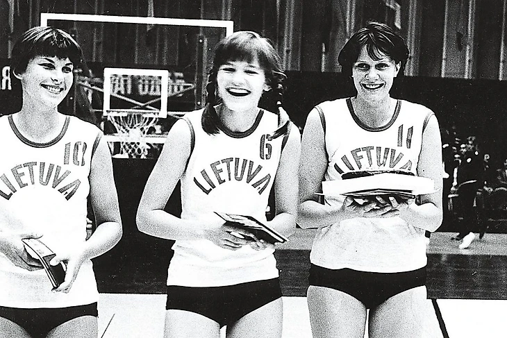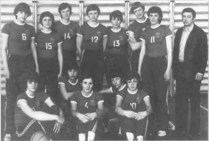 Май 1983. Москва. Дворец спорта «Динамо». VIII Спартакиада народов СССР. Игроки сборной Литовской ССР (в центре) Гинтаре Грикштайте (№ 6) и Виталия Туомайте (№ 11)