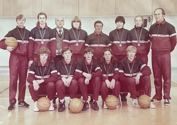 Май 1983. Москва. Сборная Латвийской ССР — победитель VIII Спартакиады народов СССР. Сидят (слева направо): Лия Юдасе, Ульяна Семенова, Марианна Федорова, Лига Гринберга, Даце Зелтыня, Вита Элксне. Стоят: администратор Ира Страздиня, врач Лорита Сауша-Васильева, Илзе Брумермане, Майя Шилиня, тренер Андрис Пуркалнс, Илга Бриеде, главный тренер Раймонд Карнитис, Инита Рытиня, тренер-консультант Юрис Гаркалнс, Анете Муйжниеце, глава делегации — президент Федерации баскетбола Латвийской ССР Артурс Пуненовс