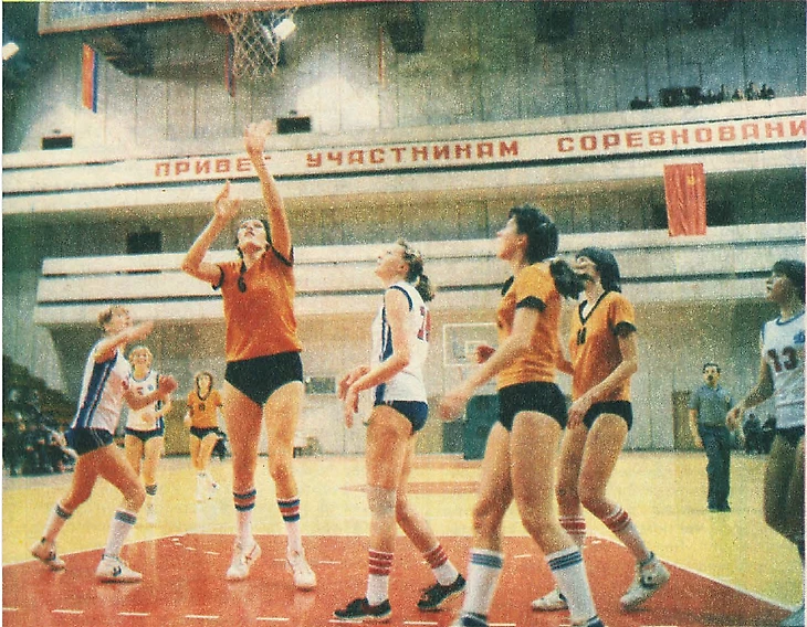 Май 1983. Москва. Дворец спорта «Динамо». Матч VIII Спартакиады народов СССР. Атакует Ульяна Семенова из сборной Латвийской ССР