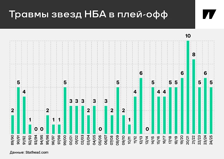 За последние пять плей-офф в НБА неизменно получали травмы в среднем семь участников Матча всех звезд, то есть в семь раз больше, чем это было в 1990-х.