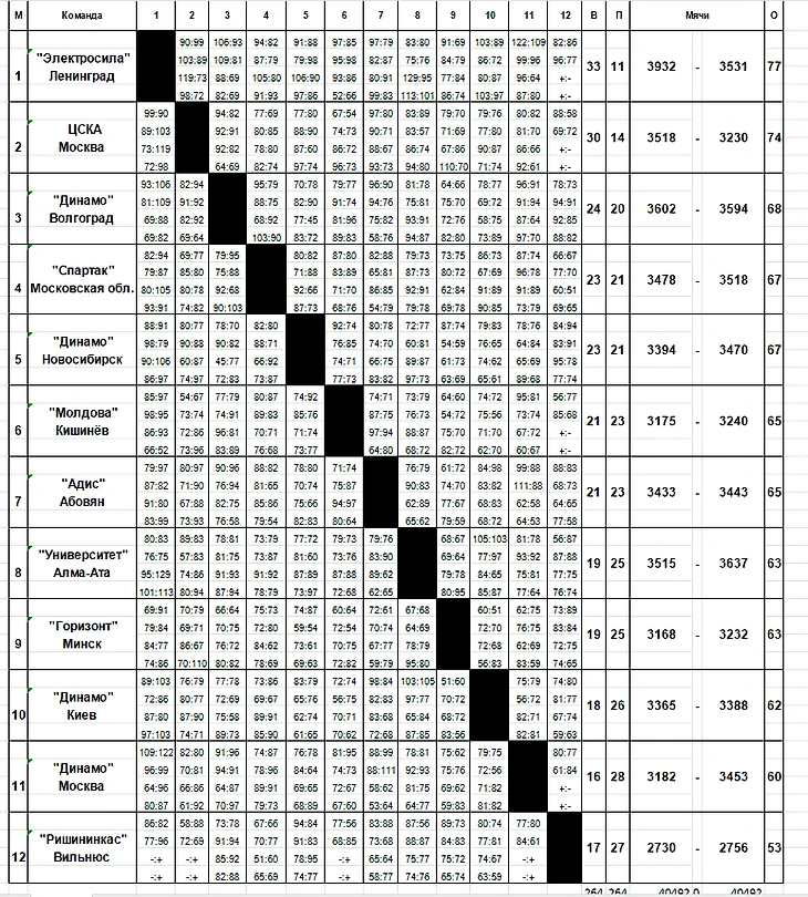 Итоговая классификация LVII чемпионата СССР. Высшая лига. 1. «Электросила» (Ленинград). 2. ЦСКА (Москва). 3. «Динамо» (Волгоград). 4. «Спартак» (Московская обл.) 5. «Динамо» (Новосибирск). 6. «Молдова» (Кишинев). 7. «Адис» (Абовян). 8. «Университет» (Алма-Ата). 9. «Горизонт» (Минск). 10. «Динамо» (Киев). 11. «Динамо» (Москва)