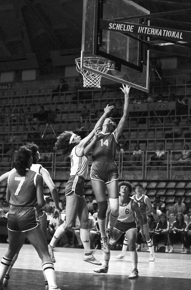 Июль 1986. Москва. Универсальный спортивный зал «Дружба». Матч Игр доброй воли СССР — Болгария — 82:56. Лариса Курикша (№ 14) атакует кольцо
