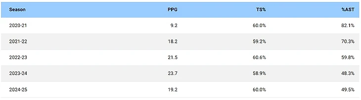 Эффективность Бэйна в нападении демонстрировала впечатляющую стабильность из сезона в сезон: его показатель эффективной точности бросков держался в диапазоне от 58,9% до 60,6%, несмотря на заметное снижение доли его бросков после передачи от партнеров.