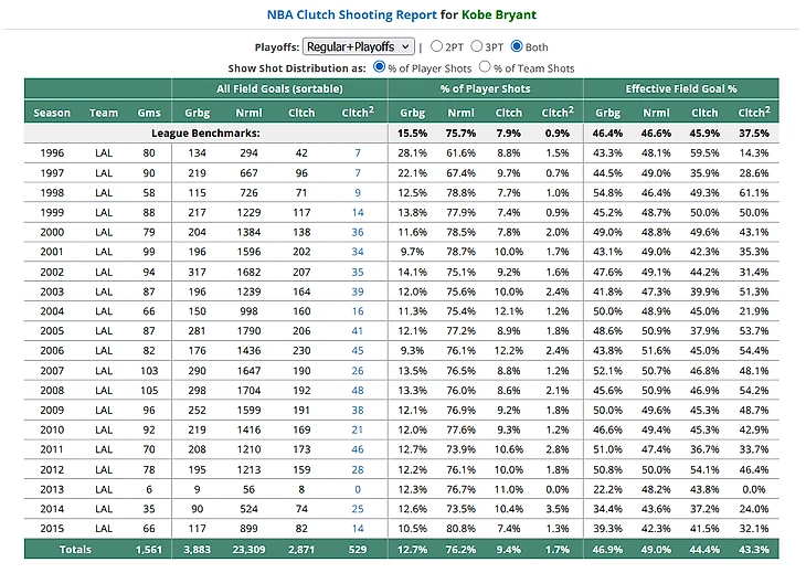 Школьник наших дней открывает basketball-reference и находит там: точность попадания Кобе Брайанта с игры за карьеру составляла 45%, не сильно выше, чем у Расселла Уэстбрука, самого заплеванного из современных игроков (44%).