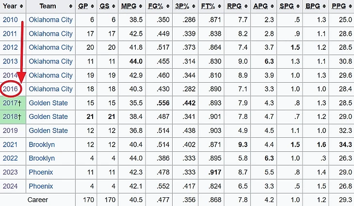 Но это не все – в конце концов, неудачный матч, с кем не бывает? Оставим в стороне лирику про «ну ты же лидер, метишь в легенды, доказывай», и обратимся к статистике. Так вот – тот плей-офф стал для Дюрэнта худшим по бросковой эффективности за последние 5 розыгрышей и третьим худшим в карьере.