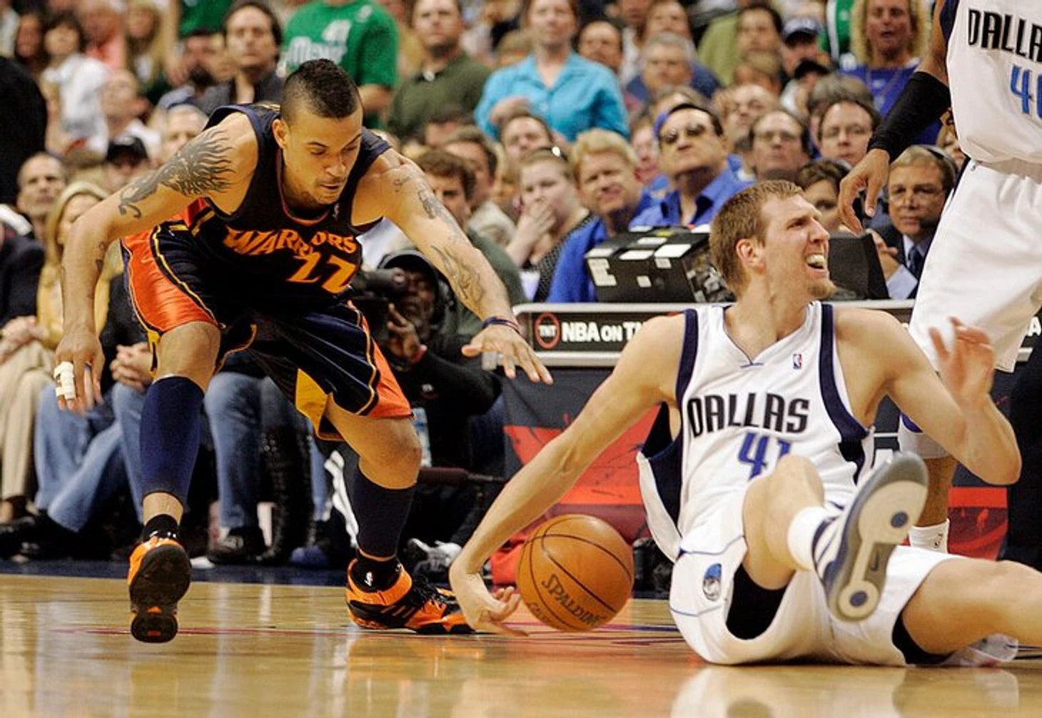 В 2007-м «Мавз» развили успех. Их 67 побед – по сей день абсолютный рекорд франшизы, которая и до 60 дотягивала всего дважды. Оба раза, естественно, под руководством Дона Нельсона. Дирк Новицки достиг пика своего признания, получив титул MVP – он еще и стал первым европейцем в истории, которому это удалось. Джош Ховард умудрился съездить на Матч всех звезд (напомню, что Бэрона Дэвиса, например, туда не взяли). В общем, в этой паре плей-офф все было ясно задолго до его начала. Некоторой перчинки добавляло противостояние Нелли и Марка Кьюбана, где каждая сторона считала себя преданной и незаслуженно оскорбленной. Вспоминали, что в регулярке «Мавз» проиграла «Воинам» все три очных встречи. Но это, разумеется, была флуктуация – и только. Тем более, что в предпоследней игре сезона сверхмотивированным «Дабс», у которых на кону стояло попадание в плей-офф, со стороны «Маверикс» противостояла пятерка, где неплохо смотрелся бы любой, читающий эти строки. Да, уважаемый читатель, я уверен, что именно ты сыграл бы в том матче не хуже, чем Грег Бакнер и Морис Эйджер!
