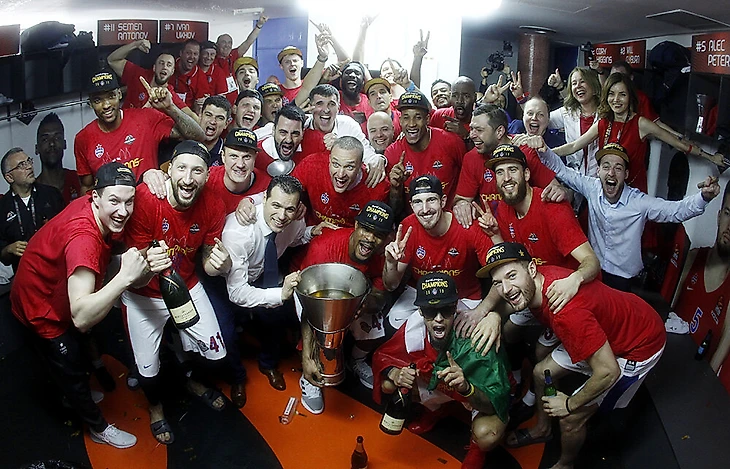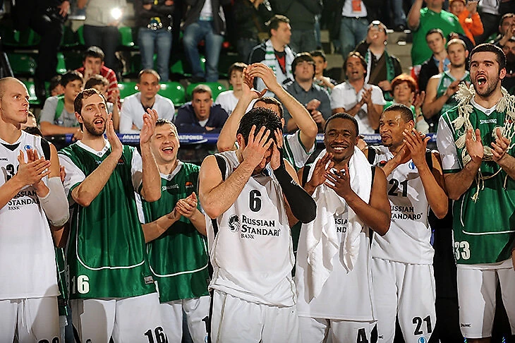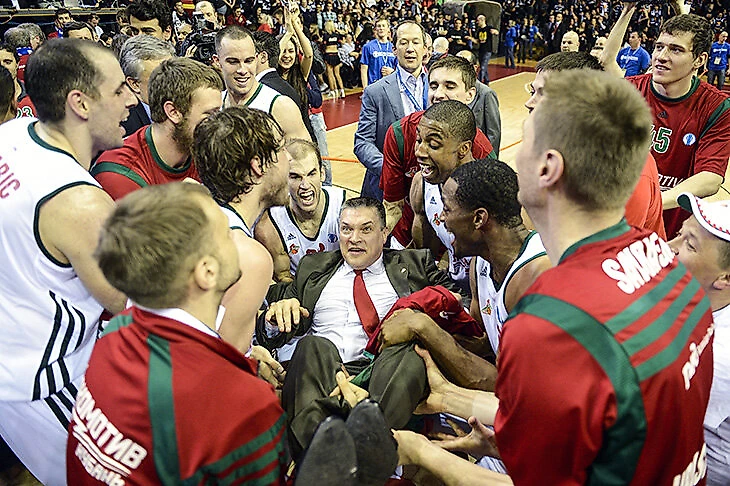 Радуются Томас Ван Ден Шпигель, Дэвид Вантерпул, Матьяж Смодиш, Дэвид Андерсен, MVP «Финала четырех» Траджан Лэнгдон, MVP сезона Рамунас Шишкаускас и Алексей Саврасенко.