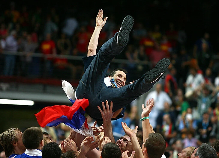 Евгения Пашутина качают после победы в Еврокубке-2013 с «Локомотивом».