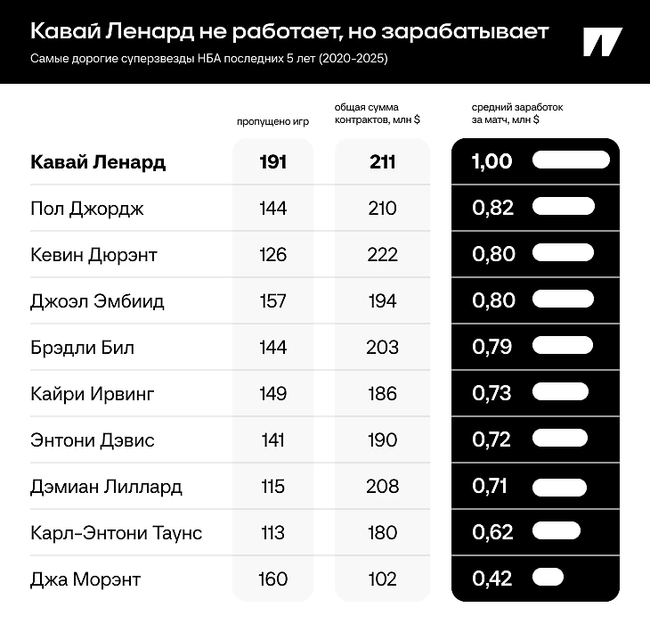 Это Бен Симмонс. За последние 5 сезонов он провел 166 матчей и заработал 177 млн – 1,06 млн за игру. Но австралийца нет в рейтинге, так как последний раз он попадал в символическую сборную в сезоне-2019/20. И с того момента, как Бен подписал гигантский контракт с «Филадельфией», Кавай уже подписал три гигантских контракта с «Клипперс» (и бог знает сколько с непонятными спонсорами). Последний из них будет действовать еще два года – если НБА, конечно, не аннулирует его по итогам расследования сделки с Aspiration.