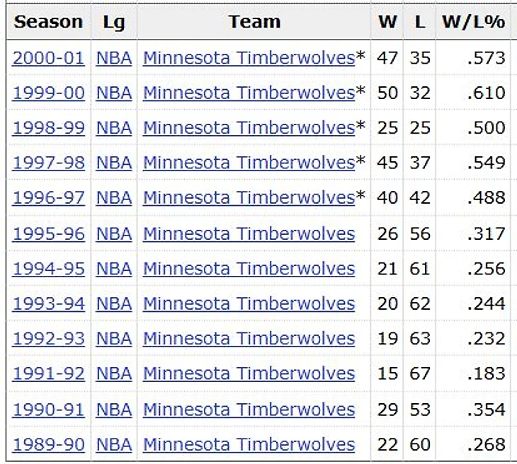 Лучшим результатом стал финал западной конференции 2004 года с возрастными Лэтреллом Спрювеллом и Сэмом Касселом. А ведь 3 пика первого раунда могли помочь команде получить необходимую глубину для скамейки либо парочку достойных игроков в старт (в том сезоне, например, центровыми команды были Эрвин Джонсон и Майкл Оловоканди, дававшие аж 5 очков на двоих в плей-офф с реализацией 40%). Весь прайм KG был испорчен руководством родной команды ради середняка, которым большую часть карьеры и являлся Джо Смит.