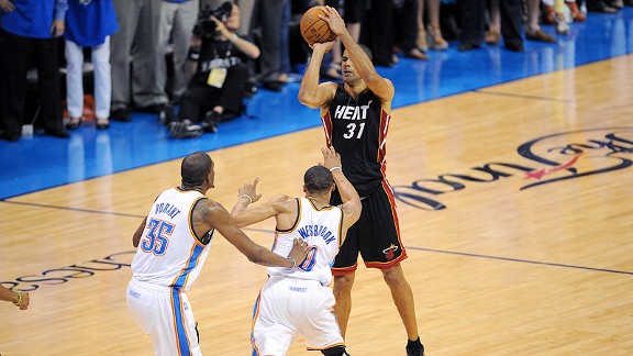 В первой игре лично мне было безумно обидно, что майамцы уступили довольно-таки большое преимущество. Причем в третьей четверти. Этот отрезок игры Хит по своему обыкновению проводят ударно. Но не в тот раз. Особенно обидно было потому, что игра Майами в нападении в первой встрече была чуть ли не образцово-показательной. Флоридцы раз за разом находили свободного игрока, который раз за разом наказывал Тандер за дабл-тимы на ЛеБроне и Уэйде.
