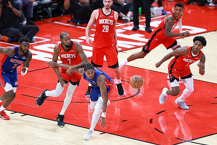 Формально – очень даже неплохо. У «Рокетс» 5-я атака лиги после первых трех матчей. Но, если посмотреть, в чем их атака хороша, то там куча подборов в нападении (что является логичным следствием их ставки на габариты и конкретного подбора исполнителей) и штрафных (что является следствием того, что они бросили под 50 штрафных против «Пистонс»).