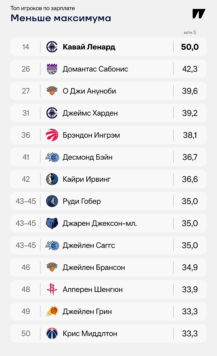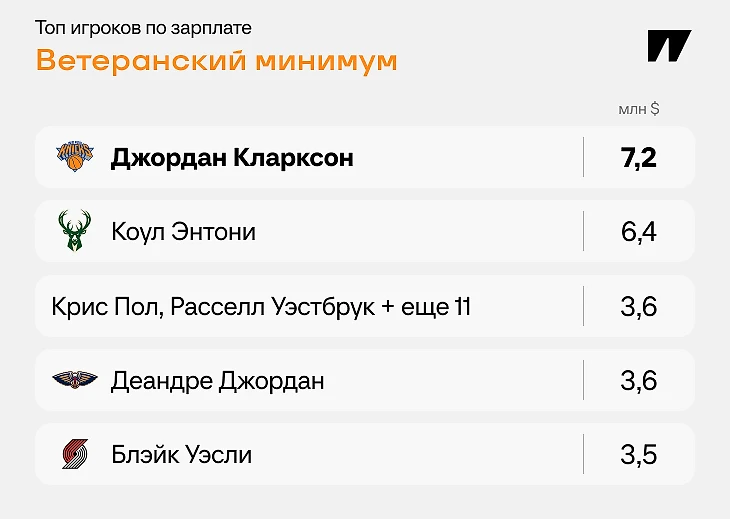 Как и максималка, минималка зависит от стажа. При 10+ сезонах за плечами самая маленькая зарплата, которую может получить игрок – это 3,63 млн (в сезоне-2025/26). Таких игроков в лиге 13, включая Пола, Уэстбрука, Кайла Лаури, Джеффа Грина. Это в районе 300-го места в НБА. А также это выше, чем средняя зарплата в НХЛ.
