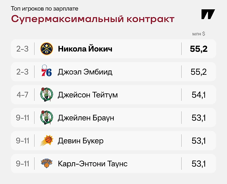 Вернемся к НБА. «Супермаксом» называют те же 35%, только получают их не за выслугу лет, а за достижения. MVP, символические пятерки сезона, звание лучшего оборонительного игрока. Такой супермакс и сам Карри подписывал в 2017-м, а сейчас в лиге 6 игроков с подобной «ранней ветеранской максималкой». Два из них – в «Бостоне»: