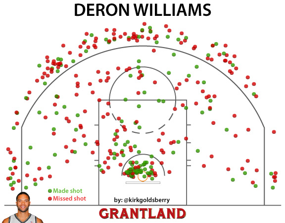 Это возвращает нас к Дерону Уильямсу. Хотя его минуты и характер остаются постоянными, его эффективность в нападении заметно снизился. Уильямс – «бросающий в прыжке» сильно прибавил в этом компоненте. Однако его общая эффективность пострадала. Старость ли это или усталость, ведь сезон он начал довольно рано, из-за Олимпийских Игр ясно одно: Дерон, «бросающий в прыжке» – менее эффективный игрок, чем Дерон, «бросающий из-под кольца». Когда он начинает атаку, пытаясь пройти под кольцо случаются прекрасные вещи: прекрасное движение мяча, открытые броски.