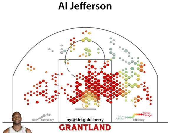 Во время прошлой беседы мы рассуждали об атакующих защитниках и их статистике из-под кольца. Сейчас же хотелось поговорить о «больших» парнях. Эл Джефферсон – игрок, который больше не развивается. Этакий прямолинейный баскетболист, атакующий из «поста». Самое страшное, что это видно не только по игре. И сейчас я приведу цифры, которые, несомненно, подтвердят это. А также цифры, которые показывают, с какой стороны игроки НБА больше всего любят атаковать.