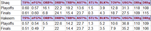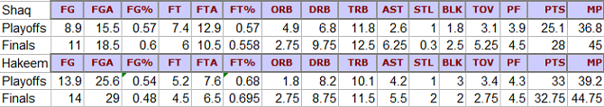 Эту заметку меня побудила создать статья "Почему Шак лучше Хакима" T-Wolves'a. В своём блоге T-Wolves, в качестве источника своих аргументов, привёл статистику финала 95-ого года Houston-Orlando. Мне она показалась не совсем полной и сейчас, в этой записи, я хочу дополнить её и сделать из этого более объективные выводы.