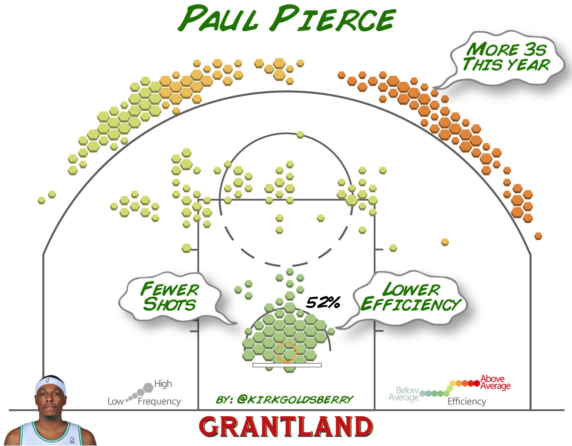 Пирсу 35, и если не произойдет чего-то экстраординарного ( а оно произошло Бостон зацепил одну игру), то его 15 сезон в НБА закончится на следующей недели. В этом сезоне Пирс бросает с 43.6 процентом филд-гола, к слову два сезона назад было 49.7. В чем же разница? Больше чем одна треть попыток приходится из-за дуги. Его эффективность из-за дуги всегда колебалась в промежутке от 38-39 процентов. Но, так как в этом сезоне он стал совершать больше бросков именно с этой зоны, то эффективность филд-гола уменьшилась. В то же самое время Пирс плохо бросает с краев. Два сезона назад, возьмем этот промежуток времени, - 31 процент его бросков с краев был реализован; в этом сезоне только 24 процента. Таким образом, диаграмма бросков Пирса претерпела изменение.