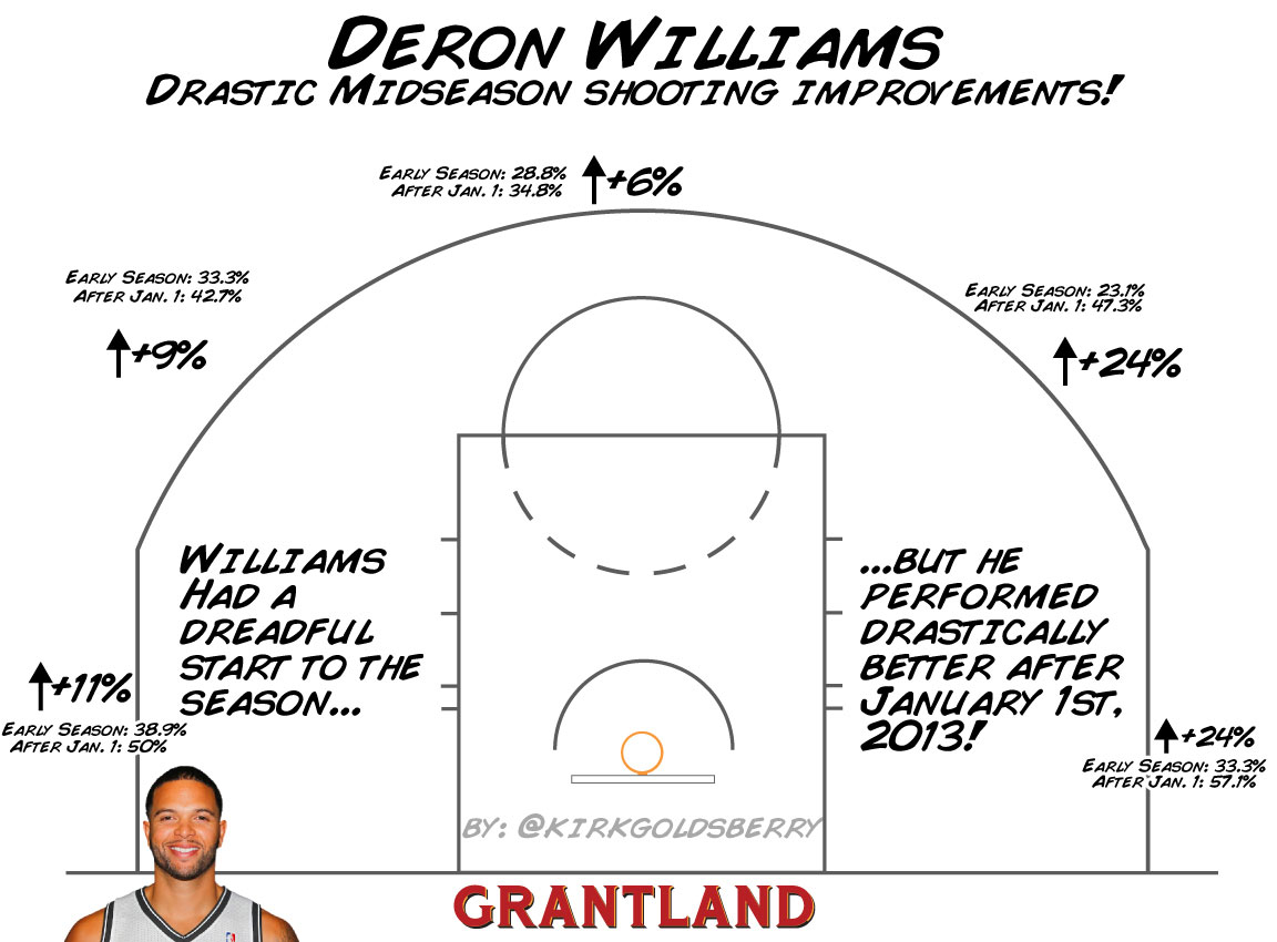 Лучше всего прогресс Дерона, опять таки, характеризует ставший намного выше процент трех. Если до 1 января Дерон бросал из-за дуги на уровне Монты и Шэннона Брауна (а это никакой уровень), то позже он стал уверенно входить в когорту лучших снайперов:
