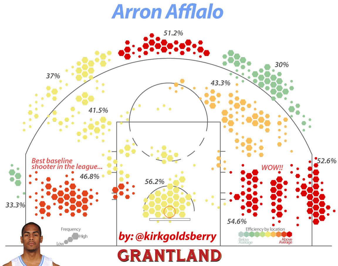 Как хорош может быть этот игрок в сильной команде? Будем надеяться, что мы вскоре получим ответ на этот вопрос. Аффлало имеет прекрасный в плане бросков сезон, несмотря на игру во второй худшей в лиге команде. Он может попасть на Матч всех звезд, но низкий индекс популярности и адрес-Орландо могут оградить его от этого достижения. Между тем, по цифрам – и, особенно, по относительно дешевому контракту – Аффлало является одним из наиболее продуктивных шутеров в соотношении «цена-качество», что естественно ведет к большому количеству слухов о его обмене. Он может забивать со всех дистанций, но наиболее эффективен он в средних бросках вдоль лицевой, где многие команды испытвают трудности.