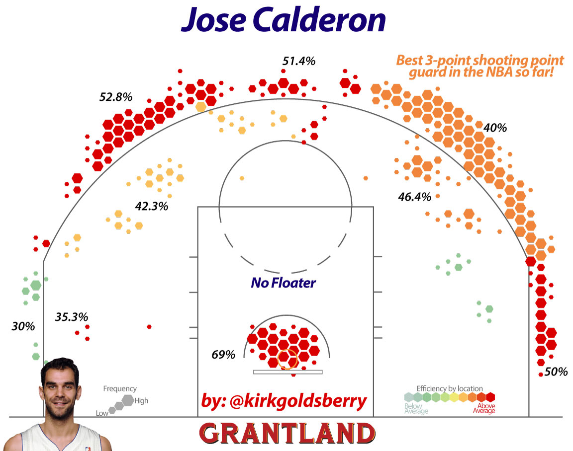 Если вам нравятся хорошие «джамп-шутеры», вы обязаны смотреть матчи «Далласа» в этом году, ведь помимо Новицки у них есть один из лучших бросающих разыгрывающих во всей лиге. Как обычно, Кальдерон реализует трехочковые с сусмасшедшим процентом, и – при всем уважении к Карри – сейчас Хосе самый эффективный при бросках из-за дуги разыгрывающий НБА. Он прекрасен везде, но особенно Кальдерон хорош в тех зонах, где вам это требуется больше всего от первого номера – наверху периметра. Он почти не бросает со средней, и в результате схема его бросков может заставить Дэрила Моури стонать от удовольствия.
