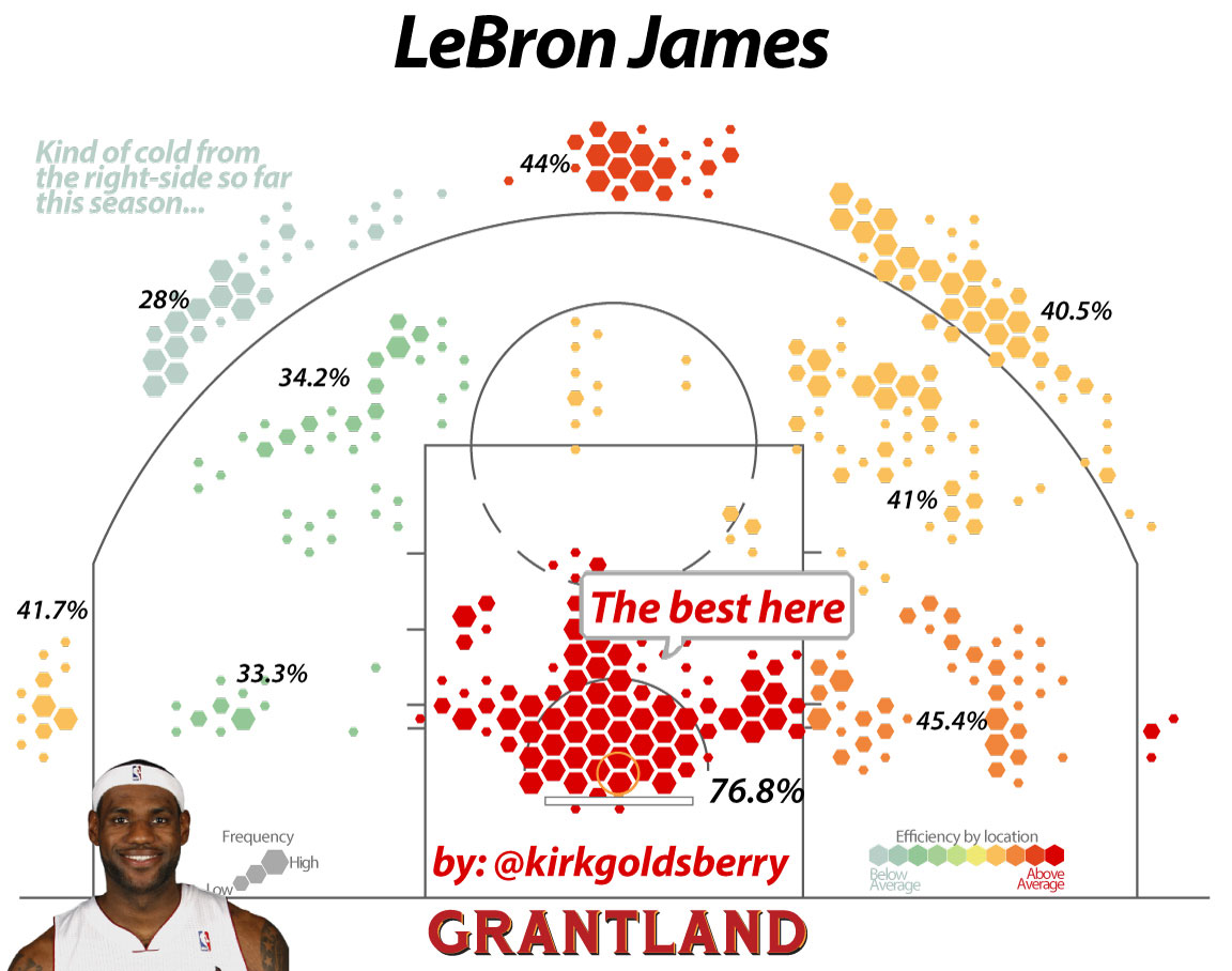 На планете нет баскетболиста лучше, чем Джеймс. Это подтверждается тем, что, как скорер, Джеймс все больше доминирует в самой важной зоне – возле кольца. В этом сезоне, 39 игроков произвели более 200 бросков в радиусе восьми футов от кольца. Только один из них имеет больше 66 % попадания бросков; это Джеймс, реализующий почти 77 процентов. С ума сойти.
