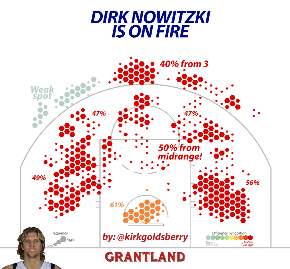 Здорово вновь видеть Дирка во всем его великолепии. Как вы видите, Новицки не боится бросать. Как и Джеймс, он добывает очки с аномальной эффективностью. В этом сезоне 27 игроков совершили минимум 200 бросков со средней дистанции, и Дирк-единственный из них, реализовавший половину подобных атак. Также он реализует 56% бросков вдоль лицевой слева от кольца-лучший показатель в лиге. Самое невероятное то, что он играет с такой эффективностью, несмотря на сложность его бросков, ведь часто Новицки сам создает для себя возможности для атаки и, как следствие, атакует кольцо, находясь под опекой защитников, понимающих, что сейчас будет делать немец.
