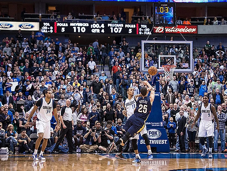 Джеймс Харден с победным выстрелом в матче с «пеликанами». И защита Остина Риверса, словно подчеркивающая ругательный характер прозвища команды.