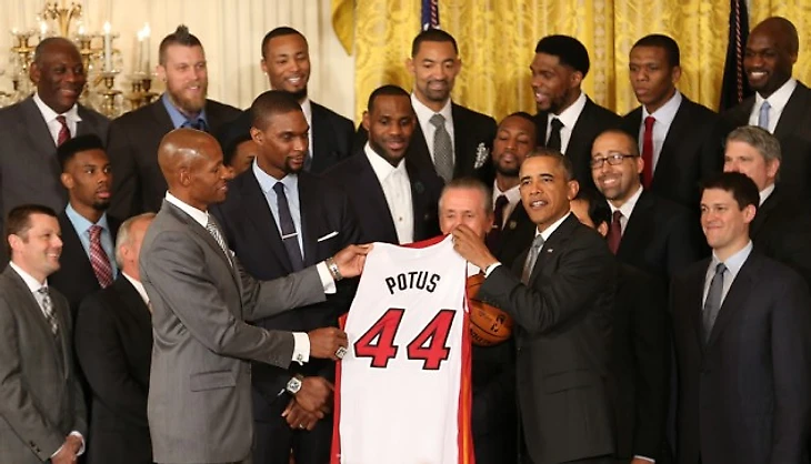 «Майами» подъехали в Вашингтон на традиционные посиделки с президентом – подарили ему именную игровую майку с 44-м номером и надписью «POTUS» (President Of The US). И Барак Обама, чтобы как-то развеяться, включил иронию на полную и устроил для чемпионов мини-представление: