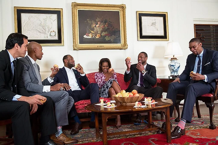 «Обычно всем очень нравится посещать Белый дом. Но должен сказать, никогда не видел, чтобы кто-либо был более рад, чем «Хит» в прошлом году. ЛеБрон настолько ошалел от радости, что мне показалось, будто он меня сейчас сшибет с ног, как того парня, который попал с центра».
