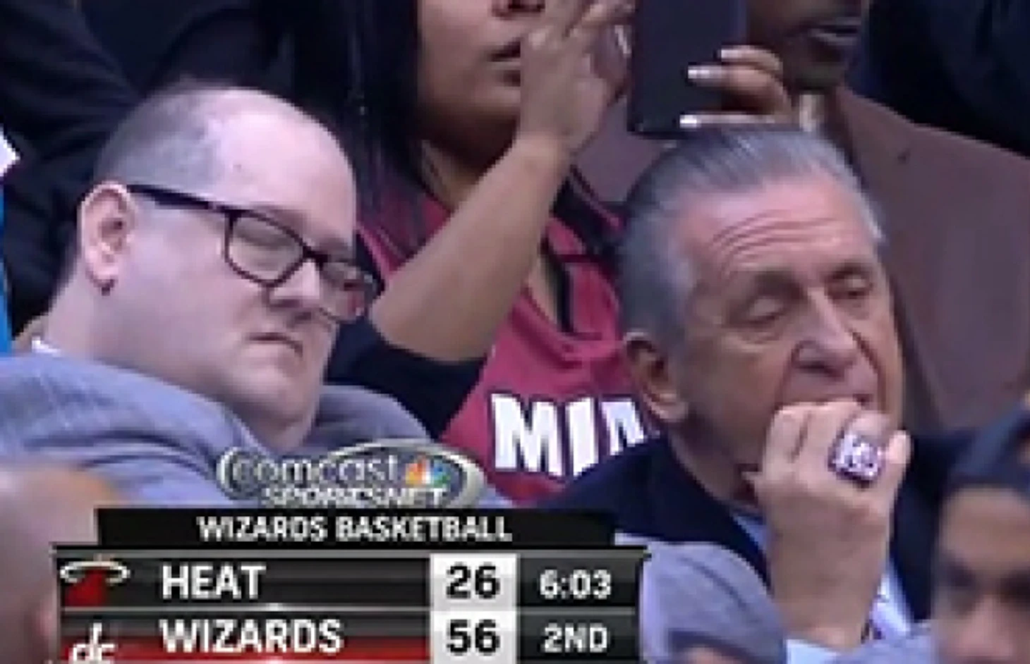 Генеральный менеджер «Хит» Энди Эллисбург прикорнул рядом с Пэтом Райли в то время, как «Хит» летели 30 очков от «Вашингтона.