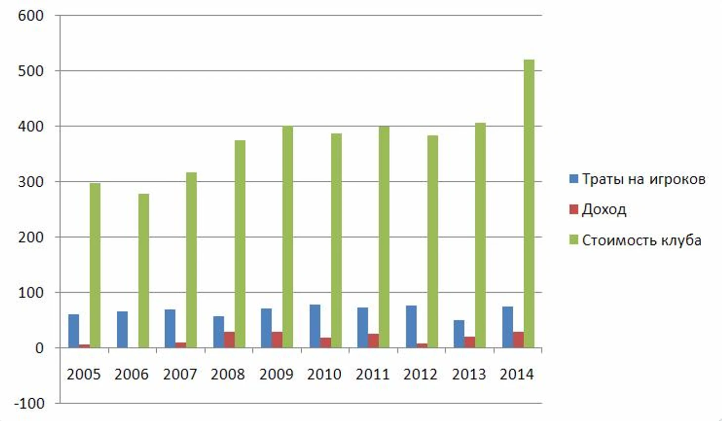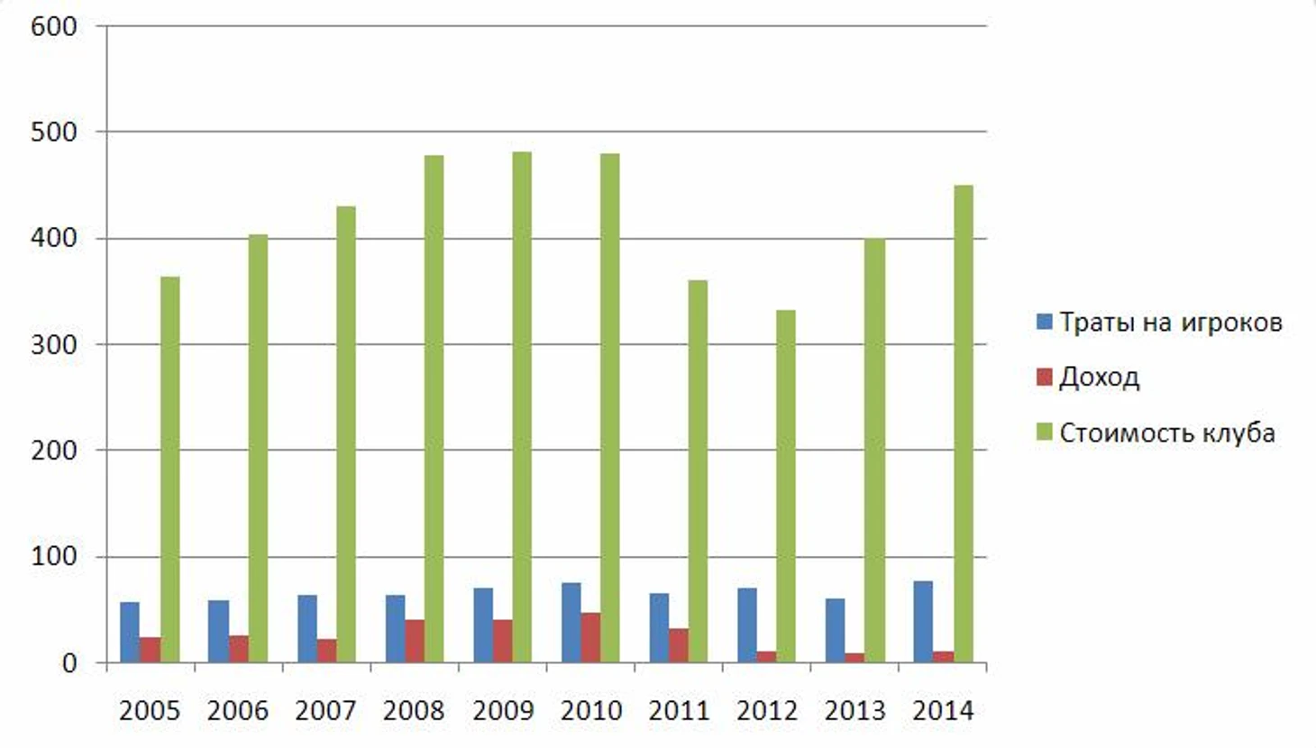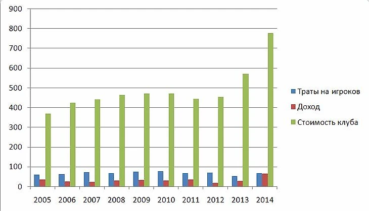 Составляющие: бренд (132 миллиона), стадион (288 миллионов), рынок (405 миллионов), спорт (185 миллионов)