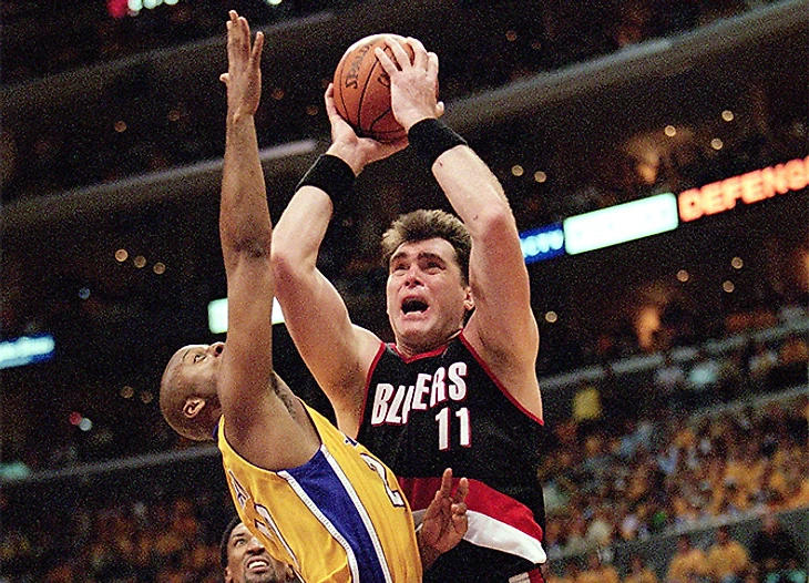 Вы же, однако, можете помнить 23-летнего Сабониса, который, несмотря на травму ахилла, принес советской команде золотые медали на Олимпиаде-1988, обыграв Дэвида Робинсона в полуфинале турнира, доминируя на обоих концах площадки, и заставив всех наблюдавших за ним подумать «Скауты не ошибались, говоря, что он чертовски хорош!». «Портленд» рискнул, задрафтовав его в 1986-м, затем целую вечность пытался получить Арвидаса в свое распоряжение. Он, наконец, приехал в США в 1995-м, когда травмы колен и ступней уже отобрали у него большую часть физических возможностей. Несмотря на то, что своей манерой бега он производил впечатление, будто носит бетонные кроссовки, Сабонис сыграл ключевую роль в составе «Портленда»-2000, который, увы, подавился своими шансами на чемпионство.