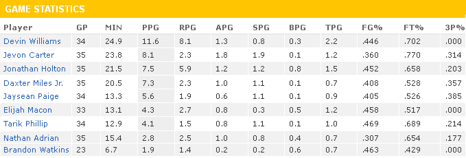 Для статуса полноценной звезды Девину не хватает всего несколько вещей. Во-первых, находиться на площадке дольше. Непрекращающийся прессинг «Западной Вирджинии» влияет на количество лишних персональных замечаний, но и без того Уильямс часто неоправданно агрессивно играет в обороне и даже нападении, что ускоряет досрочное окончание матча для него. Также он совершает катастрофически мало блокшотов (9 в прошлом сезоне, 7 в дебютном), хотя в целом это очень приличный защитный игрок. Ну и напоследок, ему нужно и дальше «полировать» свою игру в лоу-посте: пока Девин чаще пользуется силой, чем умениями, в игре под кольцом, хотя способен эффективнее обыгрывать соперников спиной и в перспективе стать игроком уровня 15+10. Может, даже в грядущем сезоне.