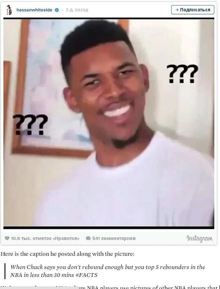 Хассан Уайтсайд ответил на критику Баркли и в качестве аргумента послал ему портрет Ника Янга.