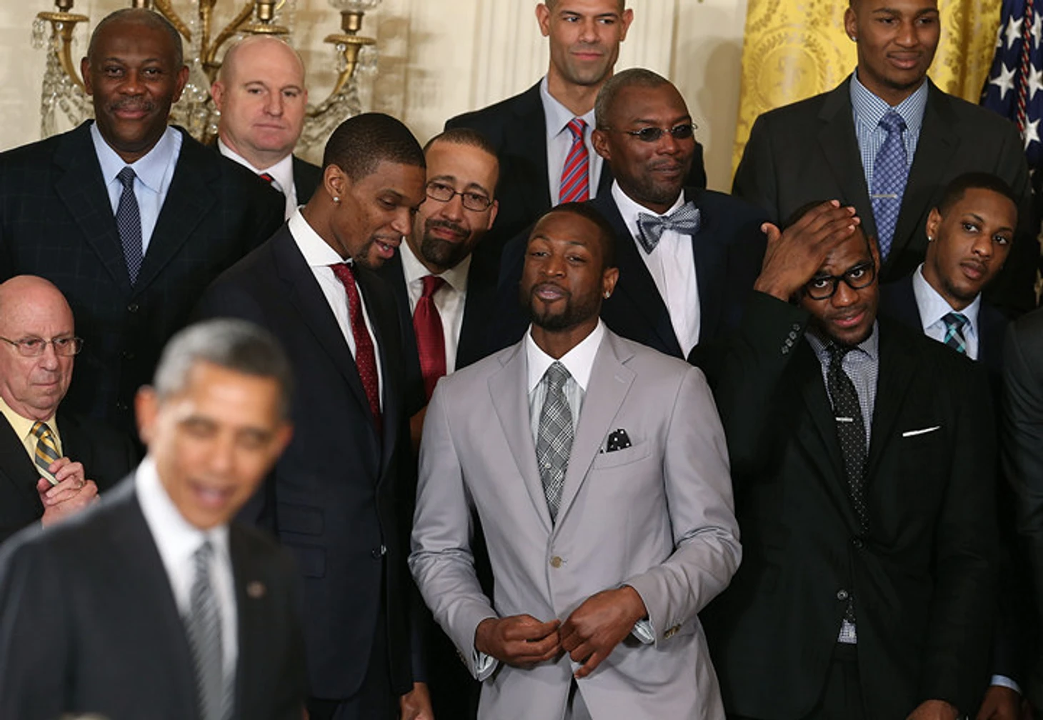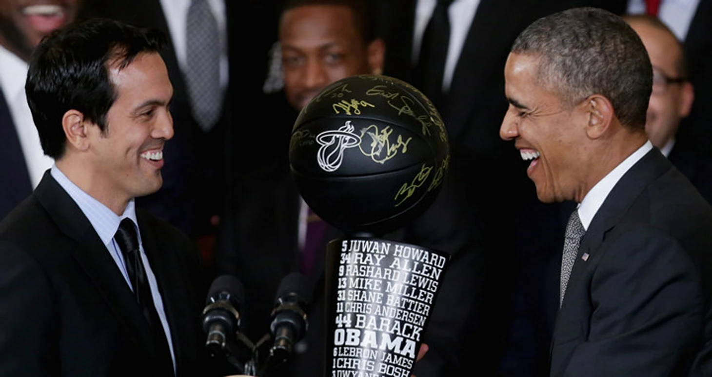 «Обычно людям нравится приходить в Белый дом. Но, должен сказать, я никогда не видел никого более воодушевленного, чем «Хит» в прошлом сезоне. Леброн был настолько возбужден, что мне подумалось, что сейчас он меня повалит наземь, как того парня в SportsCenter, который забил с центра площадки. Это было прекрасно. И прекрасно, что они вернулись».