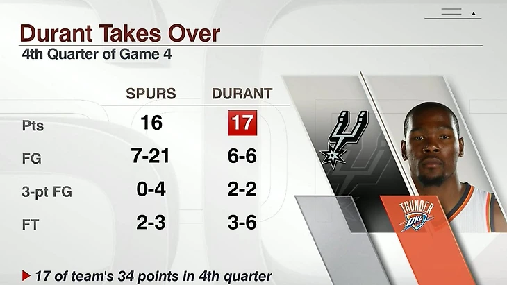 Кевин Дюрэнт явно утомился выслушивать то, что этот матч мог бы стать последним для него в форме «Тандер», а потому был заряжен на обеих сторонах площадки. Поначалу он держался несколько в тени, в первой четверти допустил несколько потерь а-ля Уэстбрук, но затем оказался вовлечен в дуэль с Ленардом и выиграл ее более чем убедительно.
