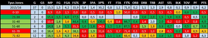 Несмотря на отвратительный старт, где-то после матча всех звёзд Джонс начал стабильно получать игровое время и стал показывать, что он не такой уж и никакашка, как казалось на первый взгляд. Тут совпали и отъезд Миллера в более тёплые в смысле побед и игрового времени края, и благим матом вопиющая некомпетентность ЛаВина на позиции первого номера, и неожиданный лично для меня прогресс игрока. Да и кто, если не Джонс, в конце концов? Результат игр значения не имел, а бэкапа натаскивать нужно, тем более, чтобы лишний раз не гневить болельщиков, с Тайусом Джонсом ещё сезона три нужно как-то сосуществовать.