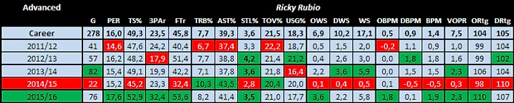 Для меня самым приятным сюрпризом стало количество игр (76), которые Рикки провел на площадке. Все остальное вторично. Если смотреть на обычную статистику, то Рубио отыграл этот сезон приблизительно на уровне своих средних показателей за предыдущие сезоны. Но этот год стал для него лучшим по PER (17,6), TS% (52,9%), WS (11,9) в пересчете на 48 минут, а также пасам (10,2) и потерям (3,0) в пересчете на 36 минут.