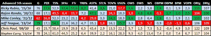 Все аспекты его игры можно считать хорошими или отличными, за исключением броска. Следует помнить, что он входит в число двух или трех лучших пасующих в Лиге, а также редко теряет мячи. Если судить по DRPM, то он уступает только Крису Полу и является одним из лучших защищающихся первых номеров, благодаря чему может попасть в одну из защитных пятерок этого года. Нужно еще упомянуть, что Рикки за карьеру отыграл 70,5% игр, в которых мог принять участие. Конечно, цифра не идеальная, но не настолько плохая, чтобы подтвердить миф о том, что он всегда травмирован.