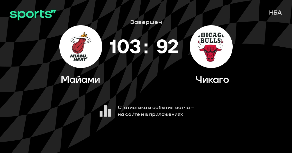 В прошедшем матче в рамках турнира НБА состоялась встреча команд Майами - Чикаго в городе Майами (США) на стадионе Kaseya Center (вместимость - 19600) со счетом 103 : 92.