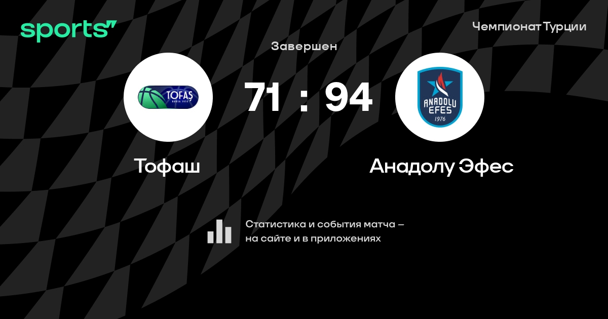 В прошедшем матче в рамках турнира Чемпионат Турции состоялась встреча команд Тофаш - Анадолу Эфес в городе Altiparmak, Bursa на стадионе Bursa Atat?rk Sport Hall