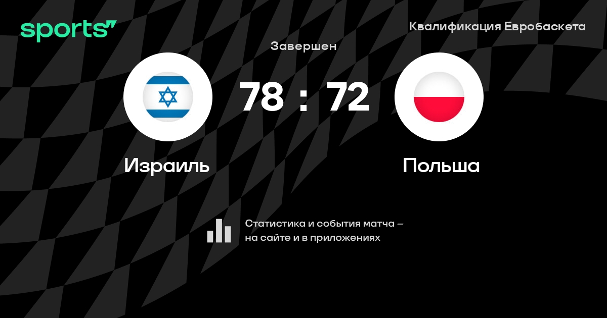 В прошедшем матче в рамках турнира Квалификация Евробаскета состоялась встреча команд Израиль - Польша в городе Валенсия (Испания) на стадионе Ла Фонтета (вместимость - 9000)